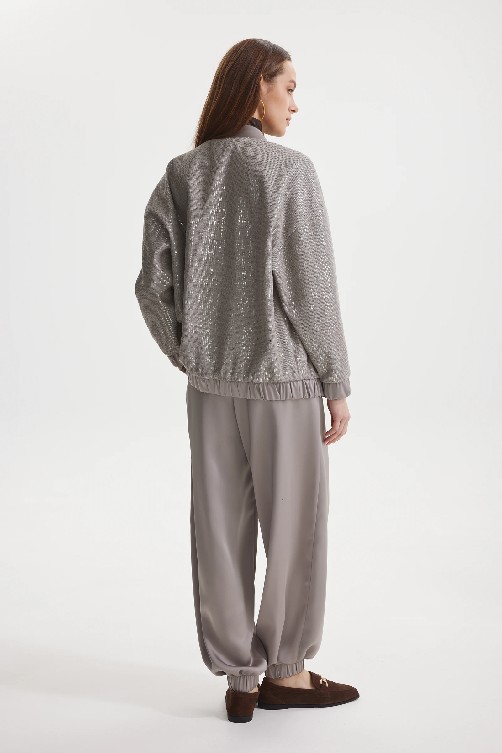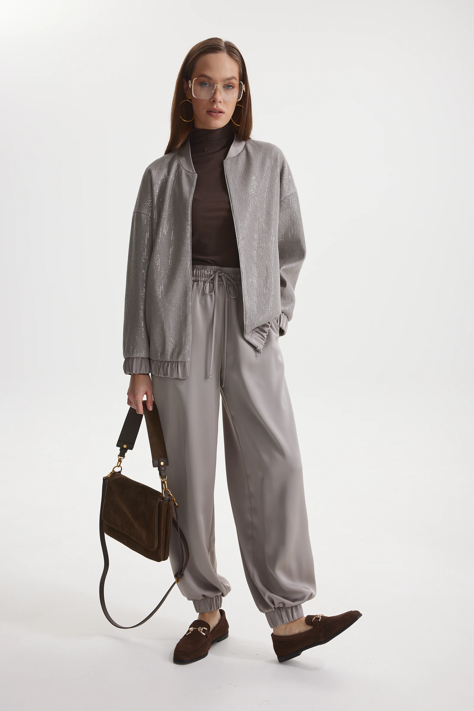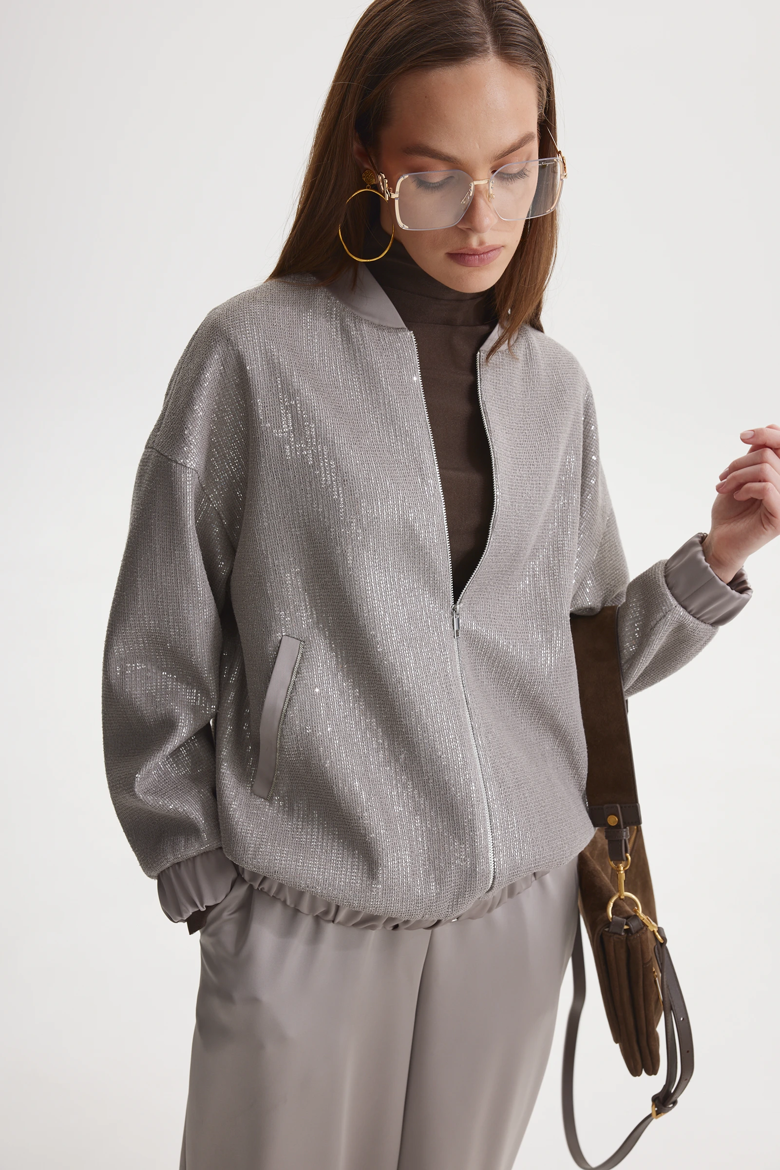 Жакет из трикотажного полотна с фактурным верхним слоем, длиной до линии бёдер, свободного кроя, со спущенной линией плеча с рукавами длиной до запястья, с воротником стойкой. Детали переда с наклонными карманами с листочкой и отделочной тесьмой в шве притачивания. Застёжка центральная на металлическую молнию. Спинка без особенностей. Низ жакета присобран поясом с эластичной тесьмой. Низ рукавов с прилегающими притачными манжетами с эластичной тесьмой. Воротник сходит на нет к центру переда. Листочки, воротник, планка низа и манжеты из отделочной атласной ткани. Жакет на подкладке.