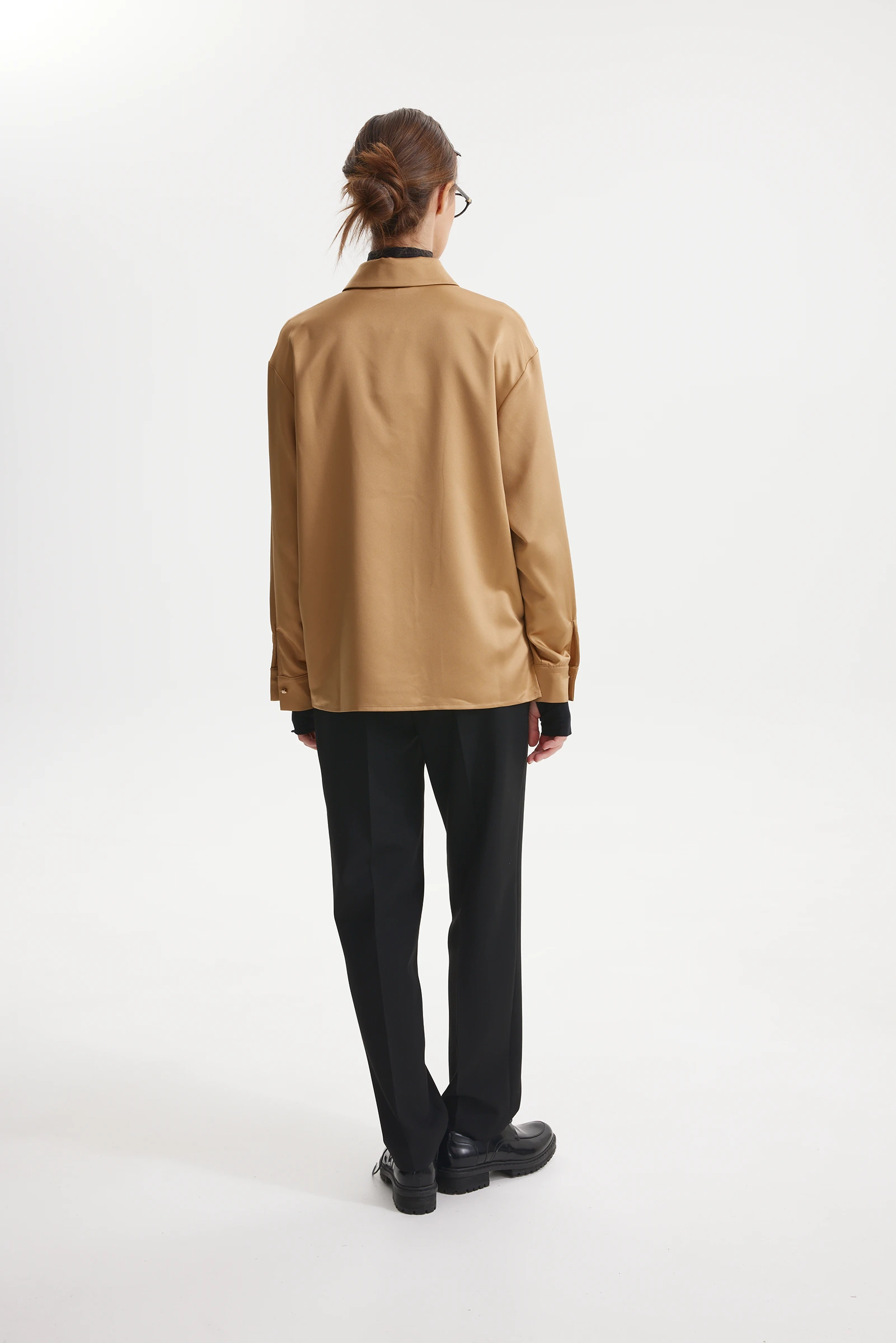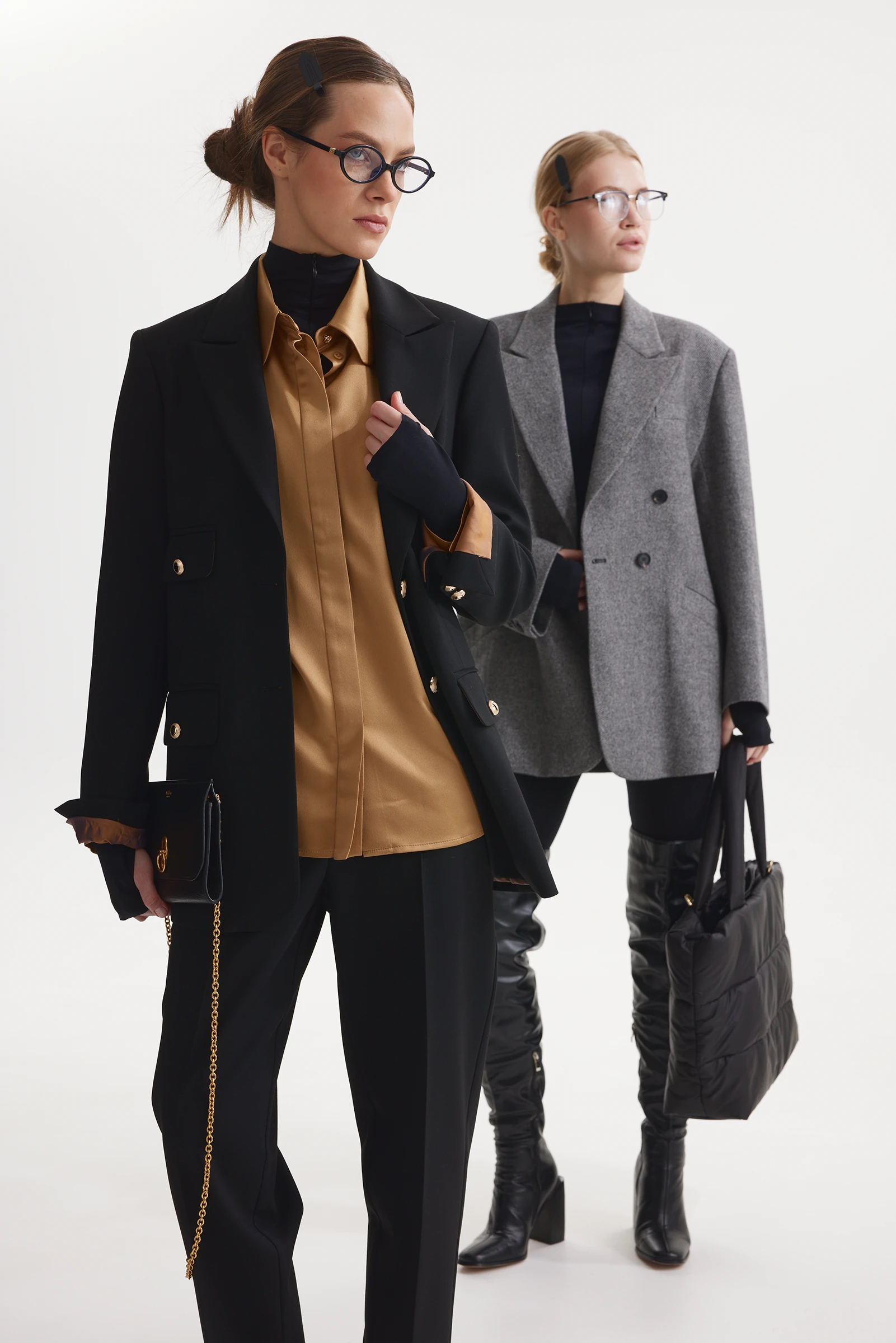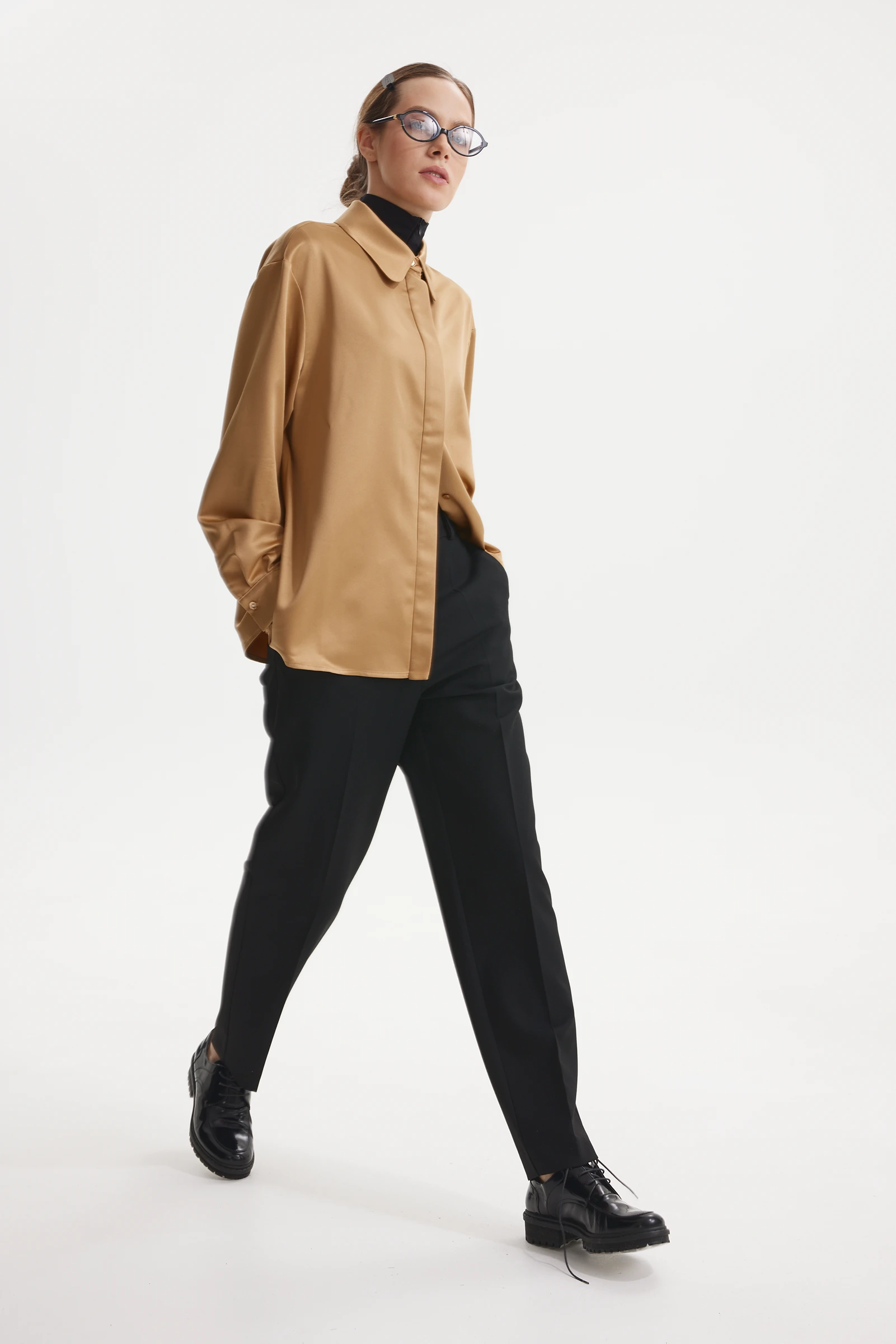Брюки из плотной костюмной ткани, с посадкой на талии, длиной до щиколотки, полуприлегающего силуэта, заужены к низу. Передние половинки с карманами, наклонными к боковым швам, с застёжкой на молнию в среднем шве. Задние половинки с талиевыми вытачками. Пояс с застёжкой на потайные крючки по центру переда, на участке спинки с эластичной тесьмой, с пятью шлёвками для съёмного пояса. По передним и задним половинкам заутюжены стрелки.