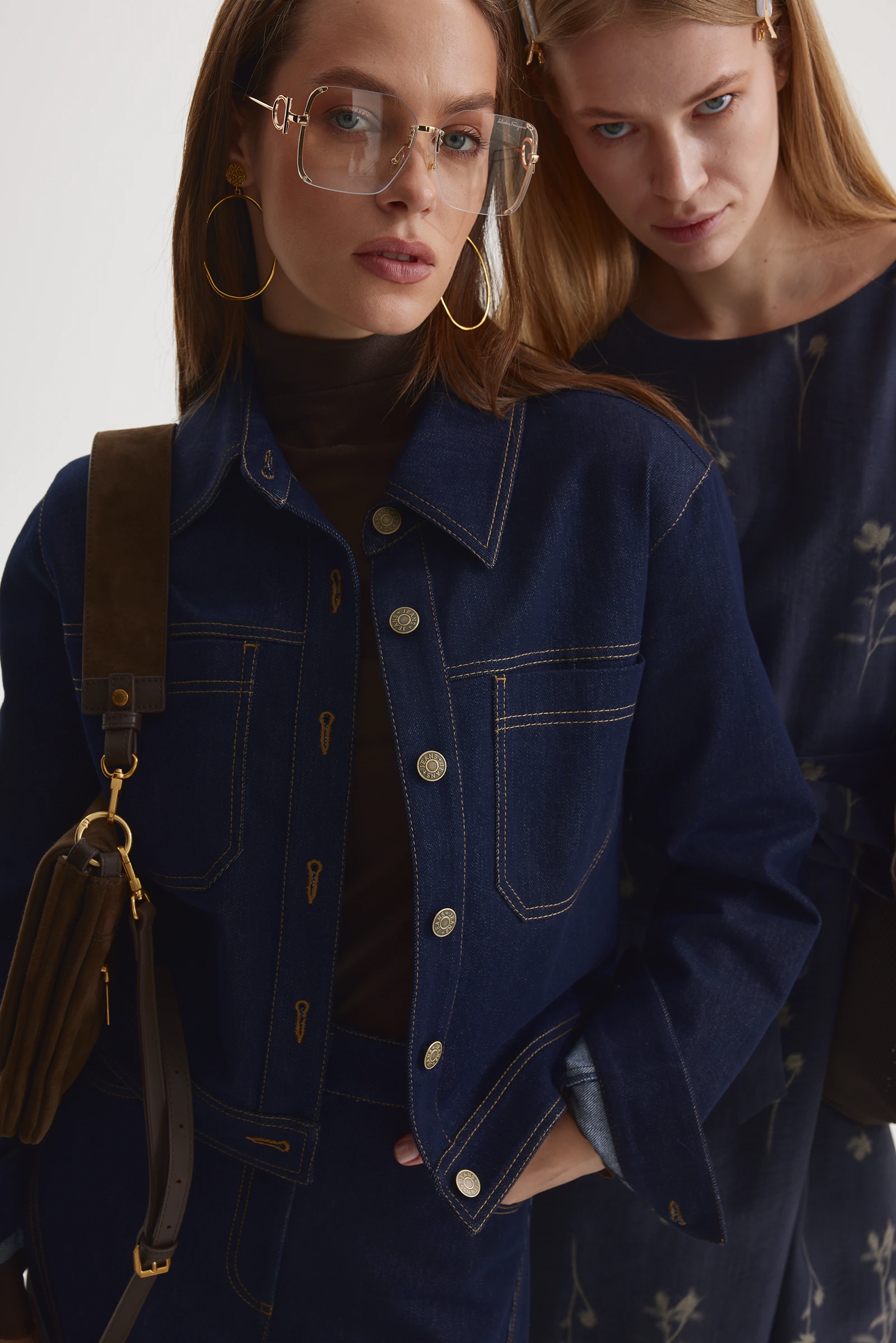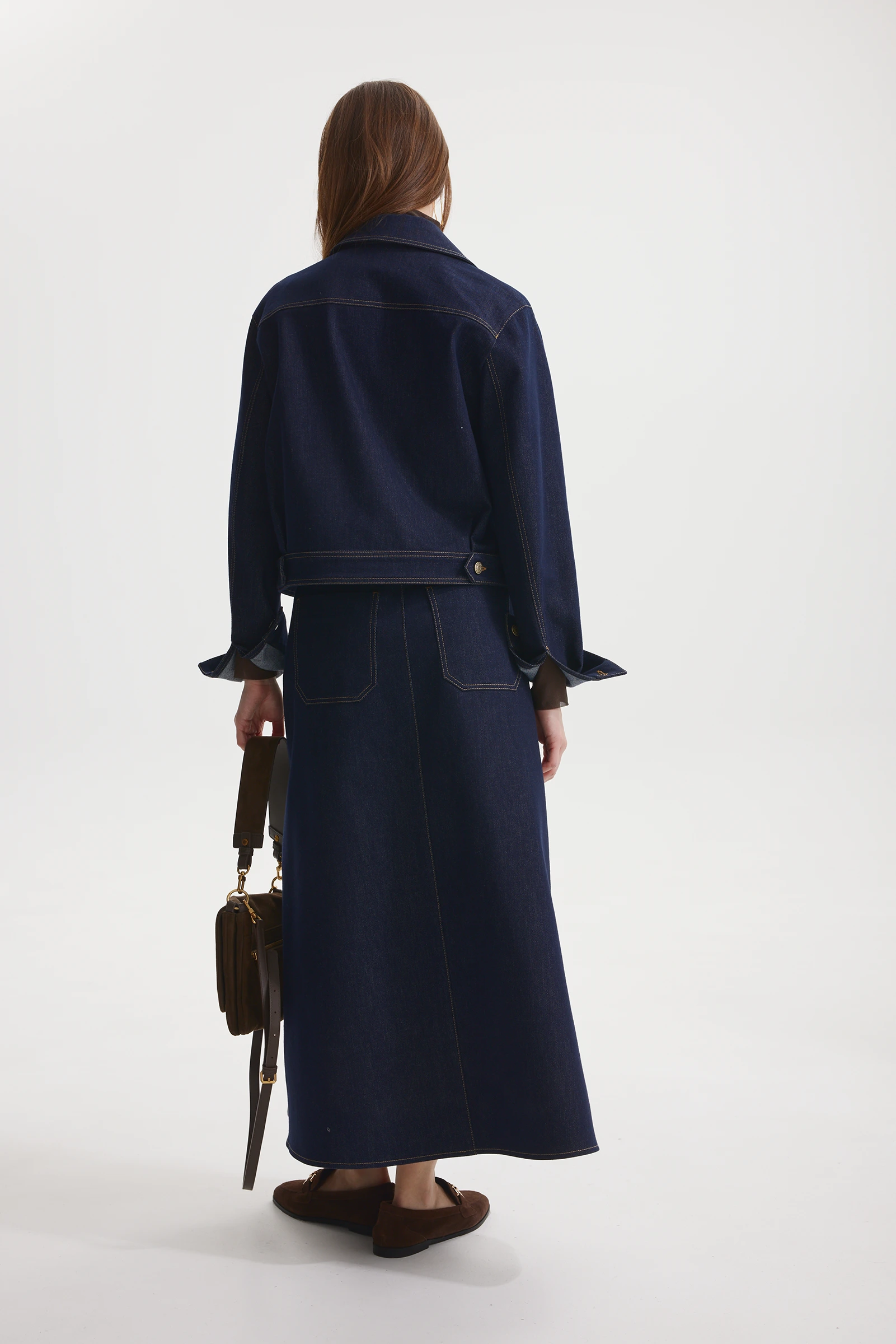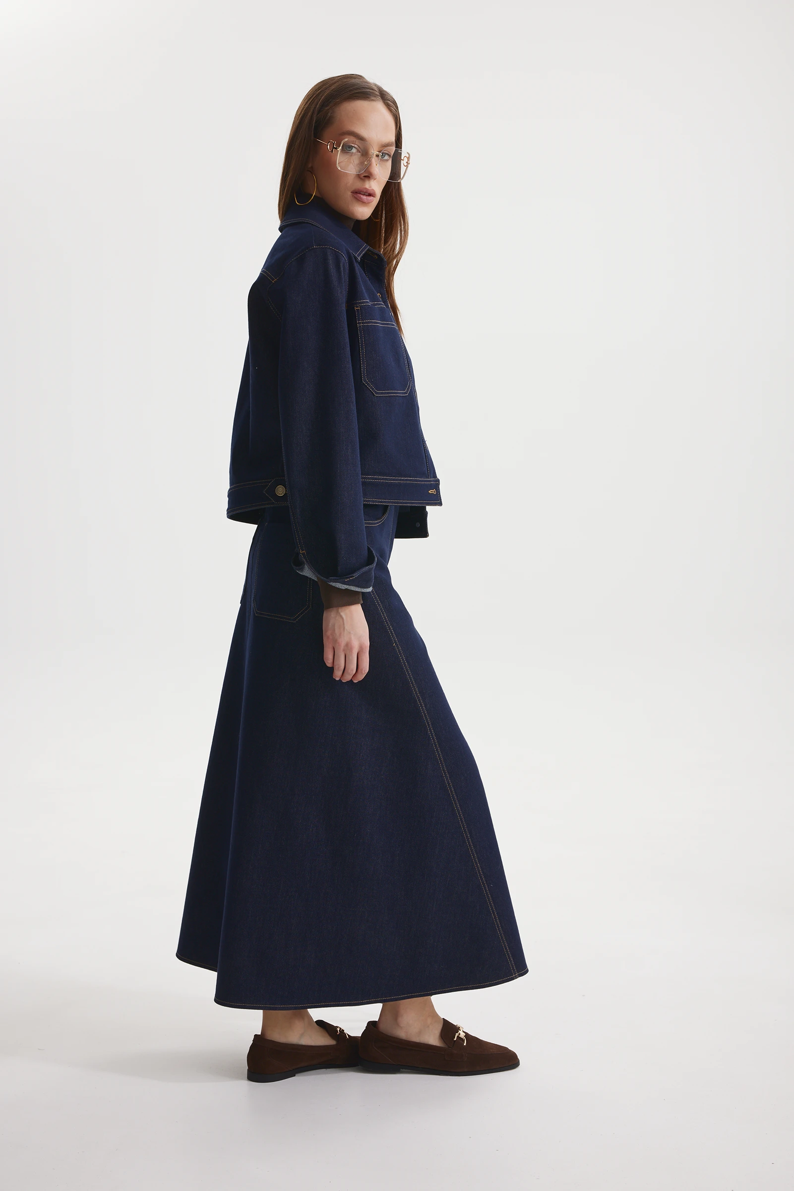 Жакет из плотного джинса, прямого силуэта, длиной ниже линии талии, с рукавами длиной до запястья, с рубашечным воротником. Детали переда с кокетками и настрочными фигурными карманами на уровне груди, с застёжкой на петли и пуговицы на притачной планке. Спинка с кокеткой выше лопаток. Рукава двухшовные со складкой по шву притачивания манжет, застёжка манжет на петлю и пуговицу. Низ жакета с притачным поясом, с настрочными фигурными патами от боковых швов, с застёжкой на петлю и пуговицу на спинке. По Контуру карманов, воротнику, кокетке, плечевым и локтевым швам прострочены двойные отделочные строчки. По верхнему краю карманов, по контуру планок и манжет, по низу и частично по пройме прострочена отделочная строчка.